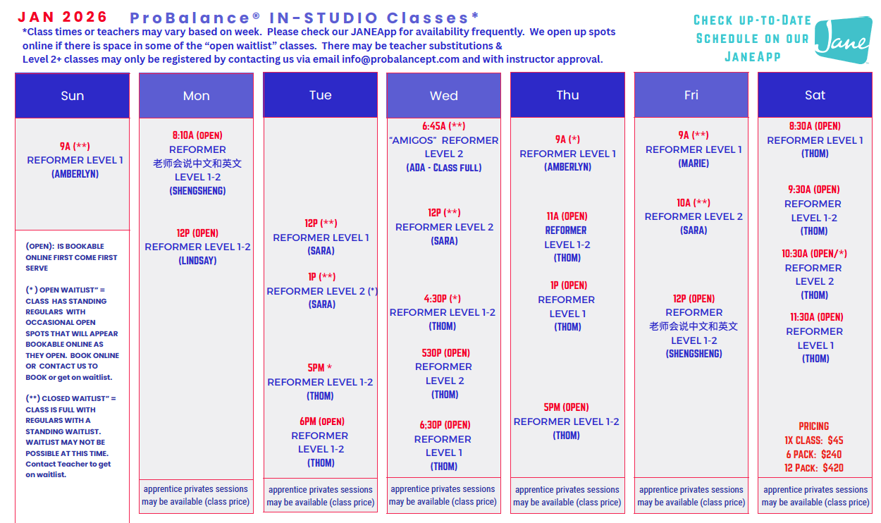 We periodically have Apprentice teachers who have been approved to see clients so they can log in their required Apprentice Teaching hours and gain experience teaching on all of the major apparatus (reformer, trapeze table/tower, combo chair, ladder barrel, and spine corrector).